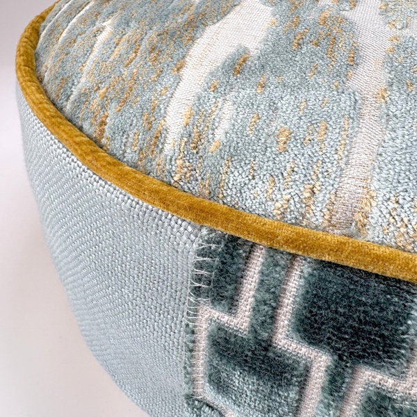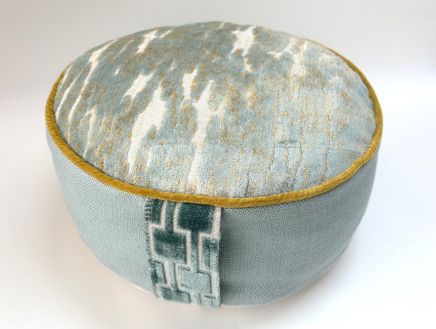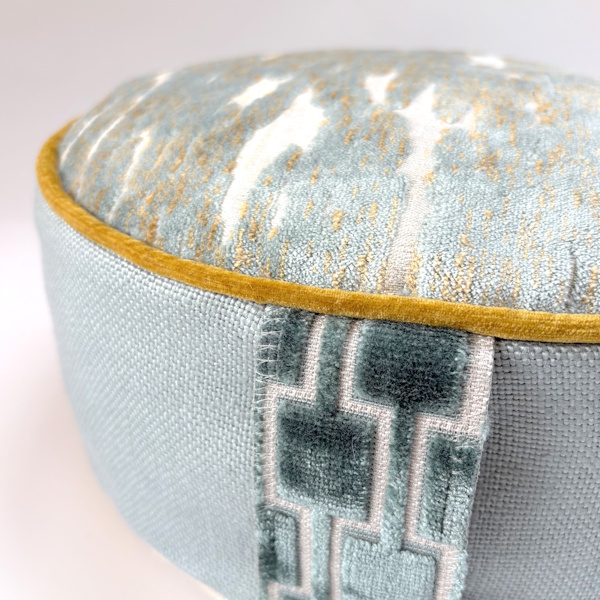 Meditatiekussen met een zeegroene/blauwe velours top, bies en handvat met een linnen zijkant.