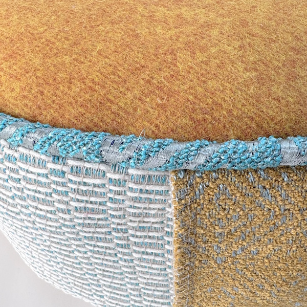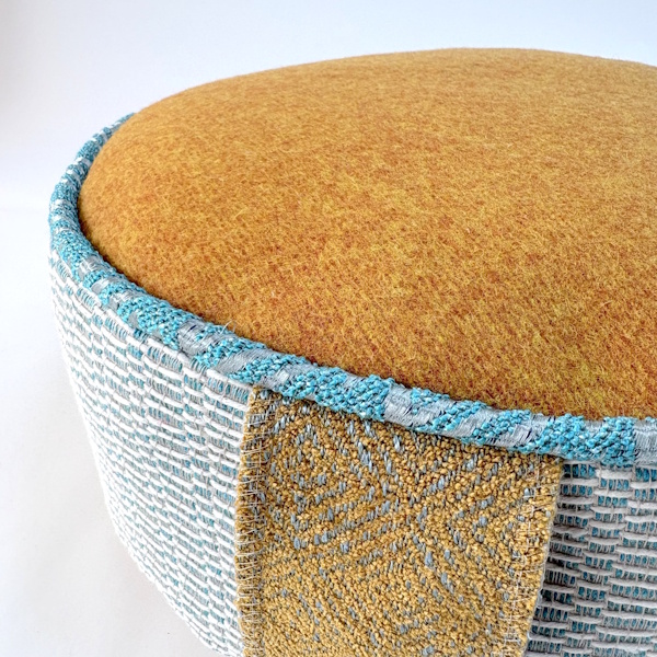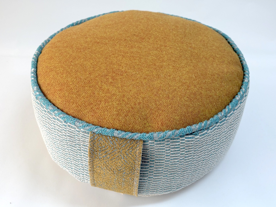 Meditatiekussen met wollen top en geweven bies. Handvat is van velours en zijkant van dikke geweven katoen. De dikke wollen stof heb ik zelf in Portugal gekocht bij een lokale weverij. waanzinnige kwaliteit!