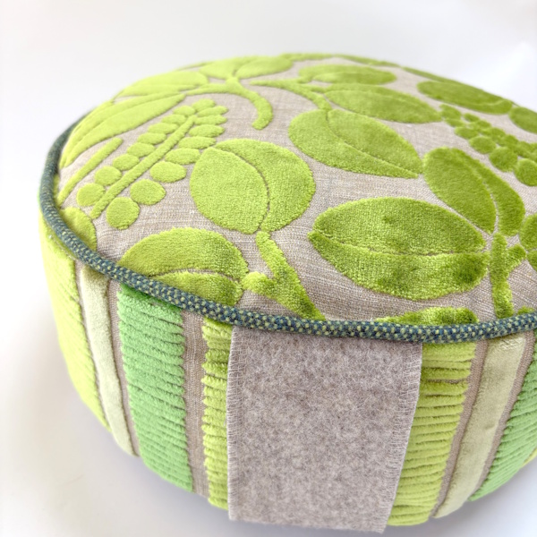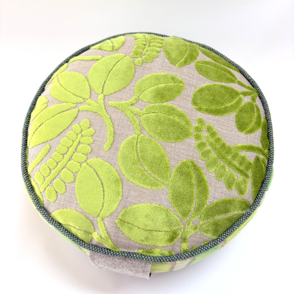 Meditatiekussen met velours top en zijkant. Bies en handvat van wol.