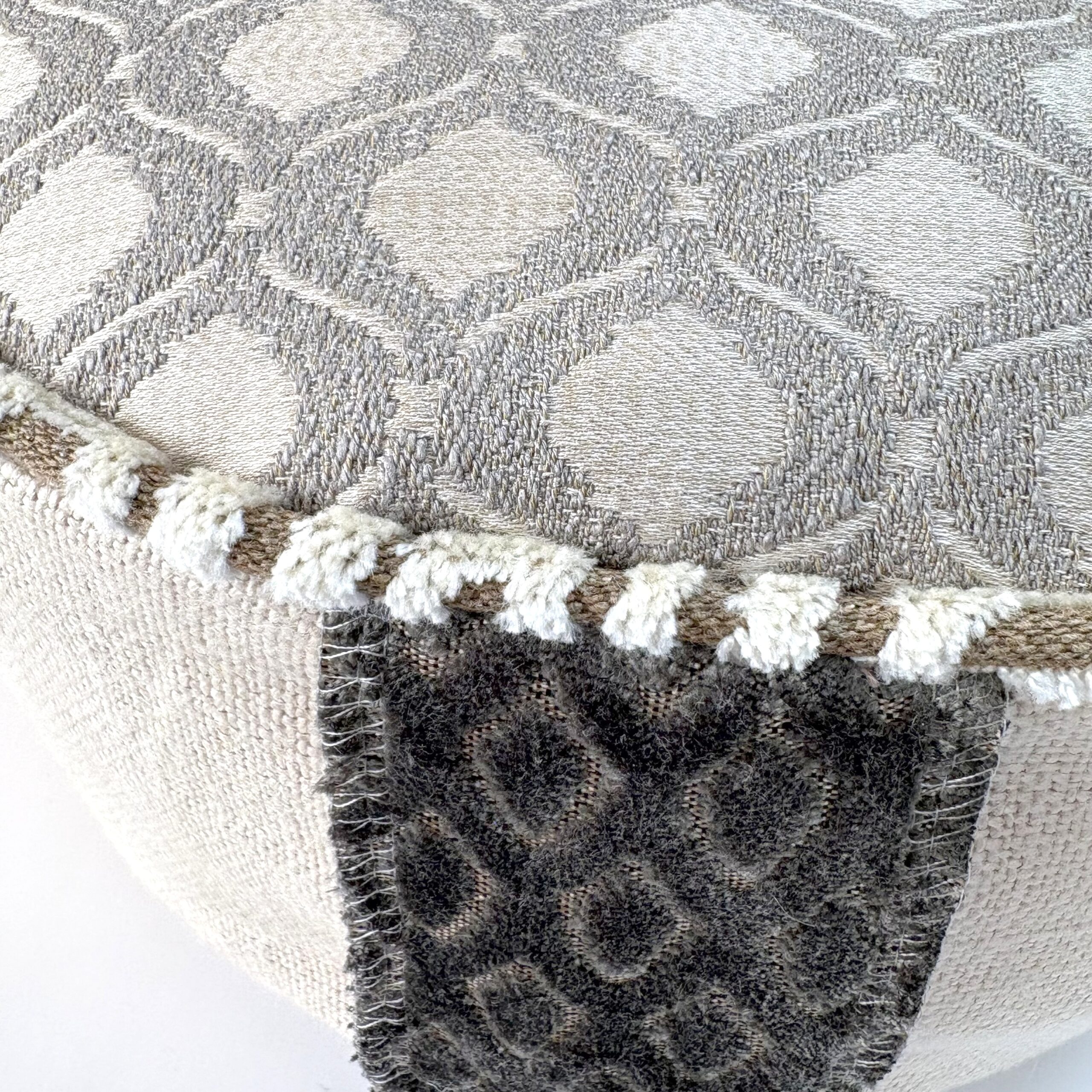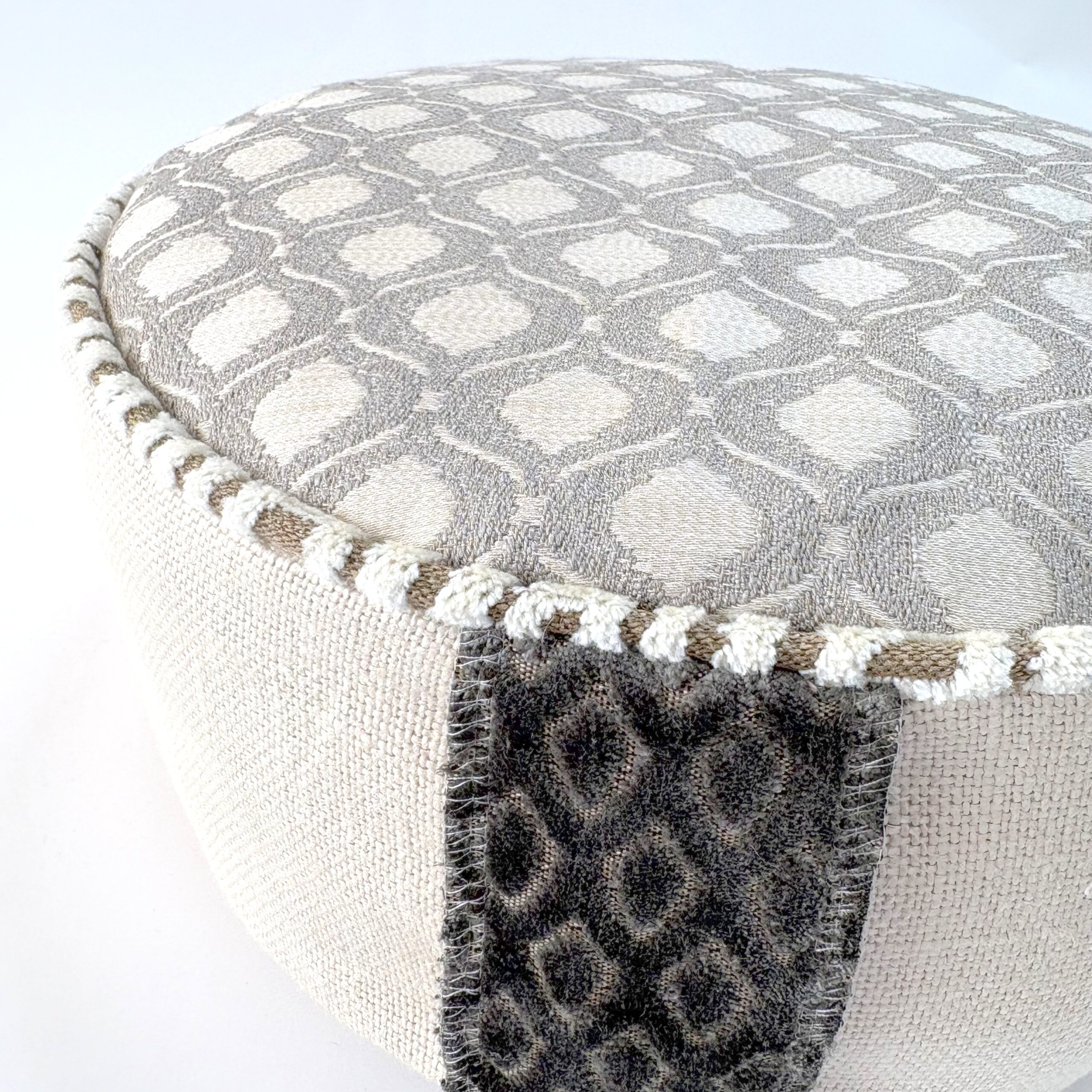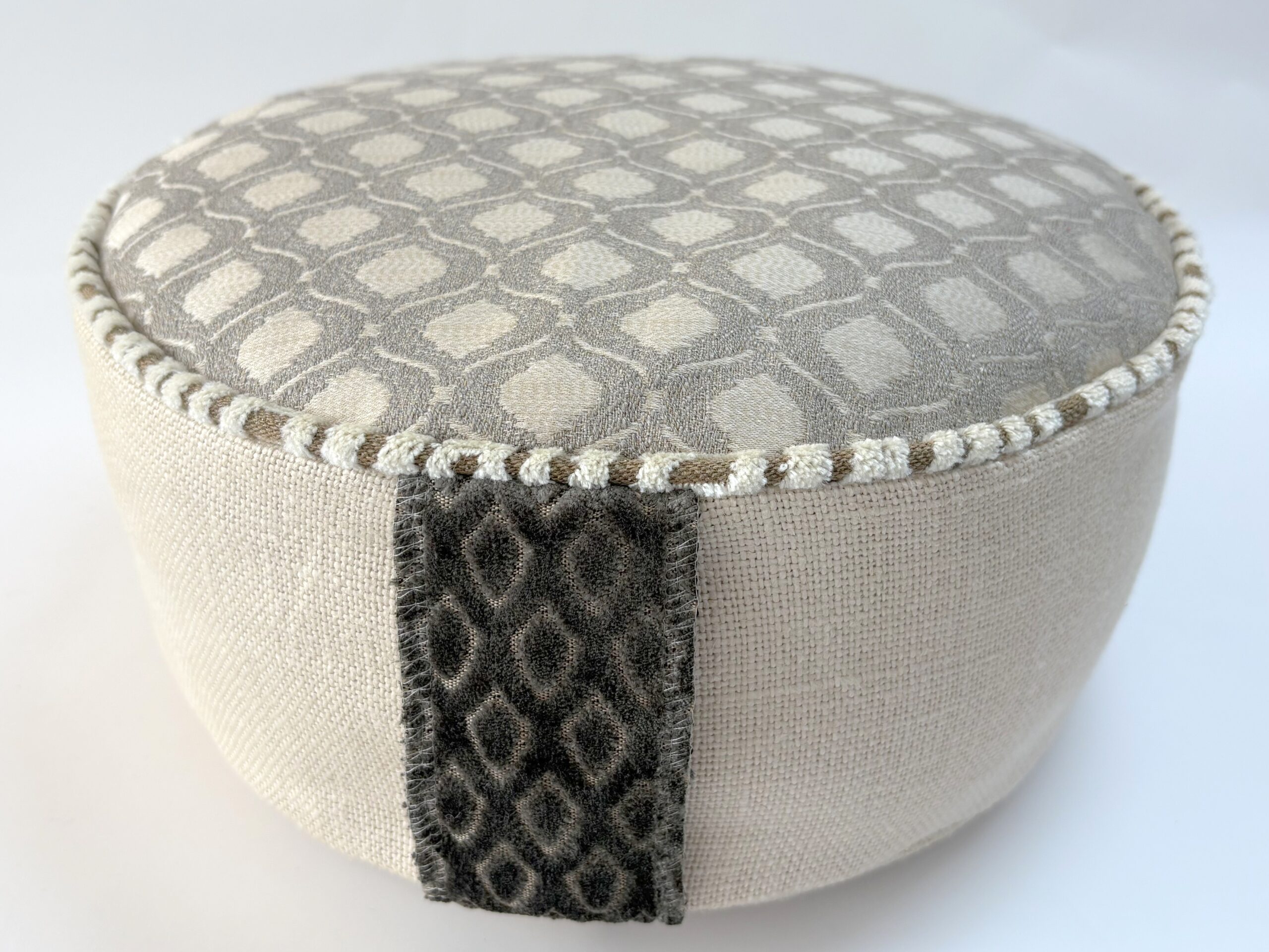 Meditatiekussen in en naturelle kleur met geweven top, linnen zijkant en handvat en bies van velours.