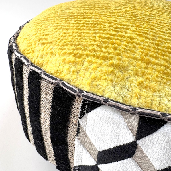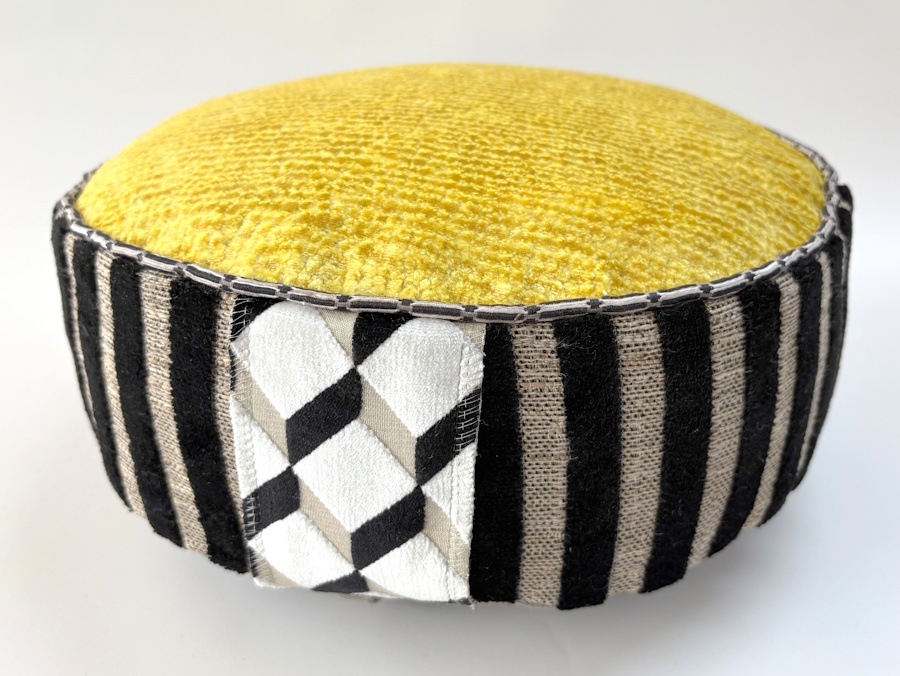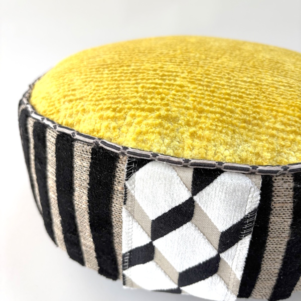 Meditatiekussen met de verschillende velours in de top, bies, handvat & zijkant.
