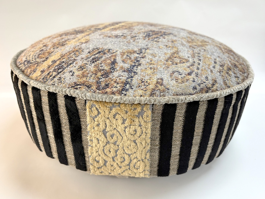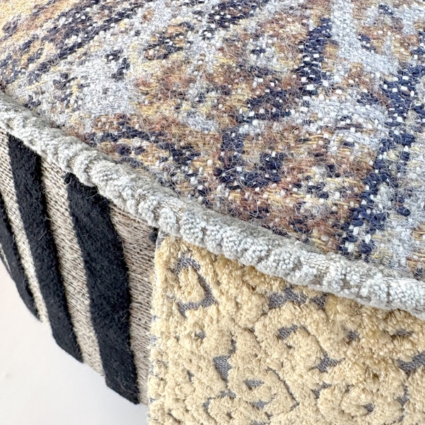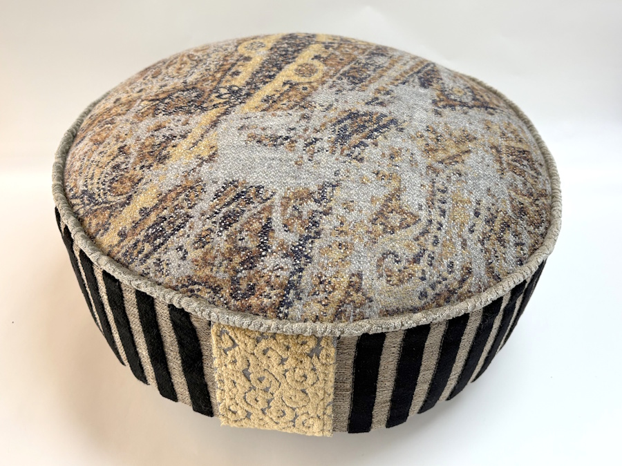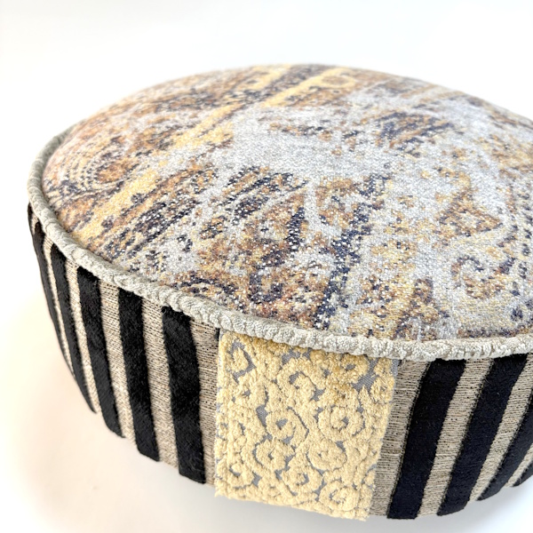 Poef of groot meditatiekussen met wollen top met een velours bies, handvat en zijkant. Gevuld met biologische boekweitdoppen.
