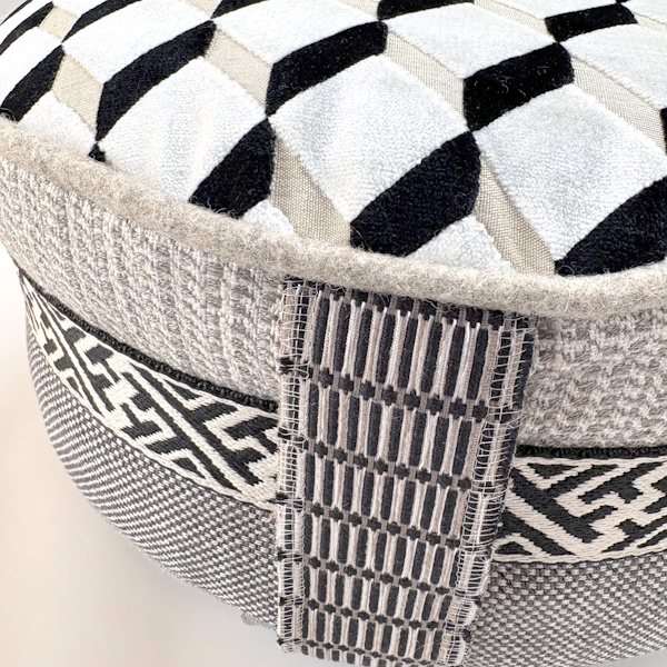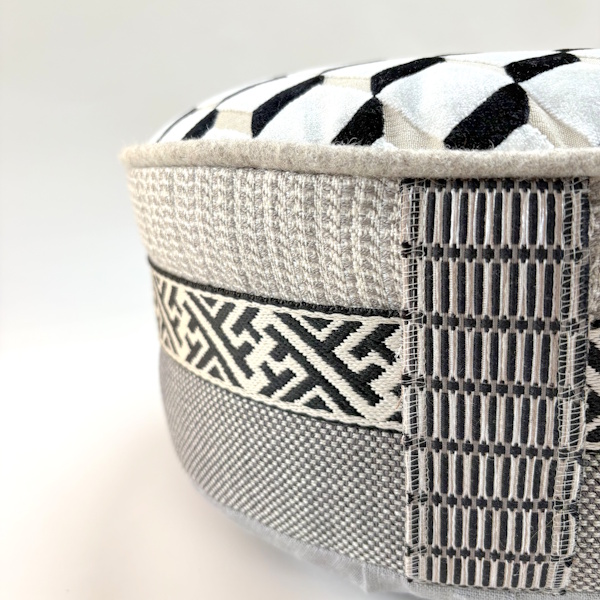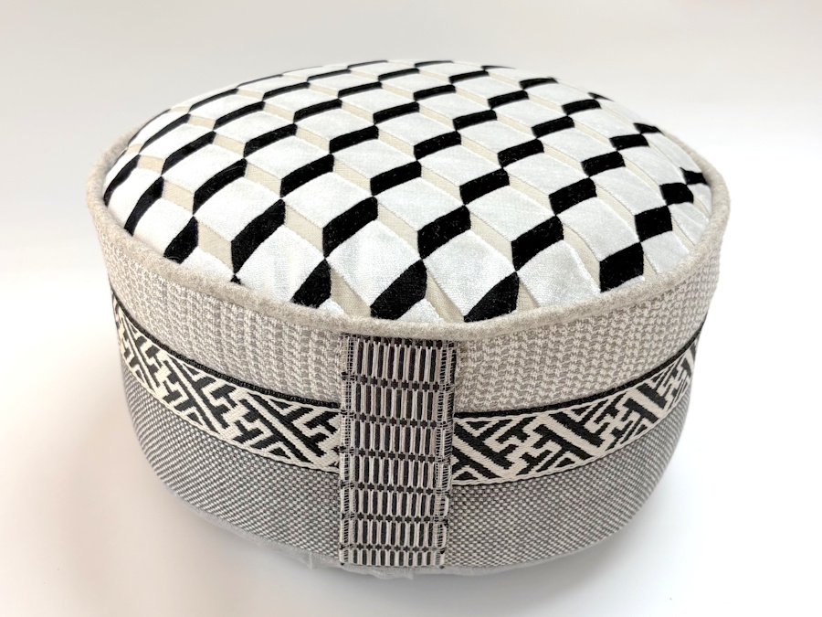 Meditatiekussen met velours top en wollen bies. Handvat van katoen met zilverdraad en zijkant in laagjes linnen en katoen met katoenen zware bies.