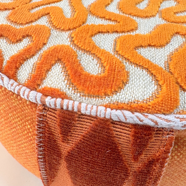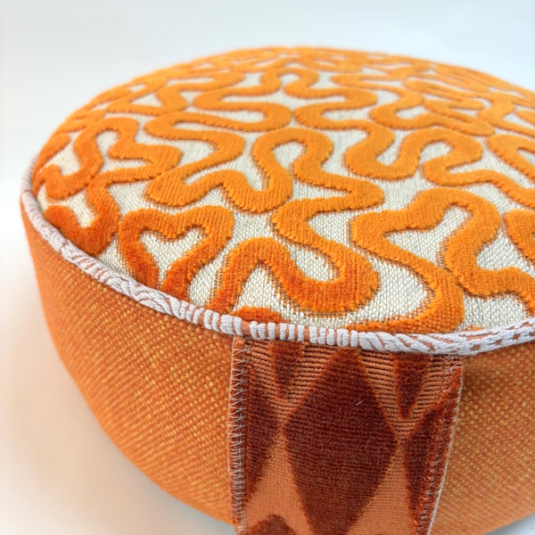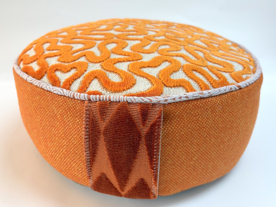 Oranje meditatiekussen met velours top, handvat en bies, zijkant van wol.