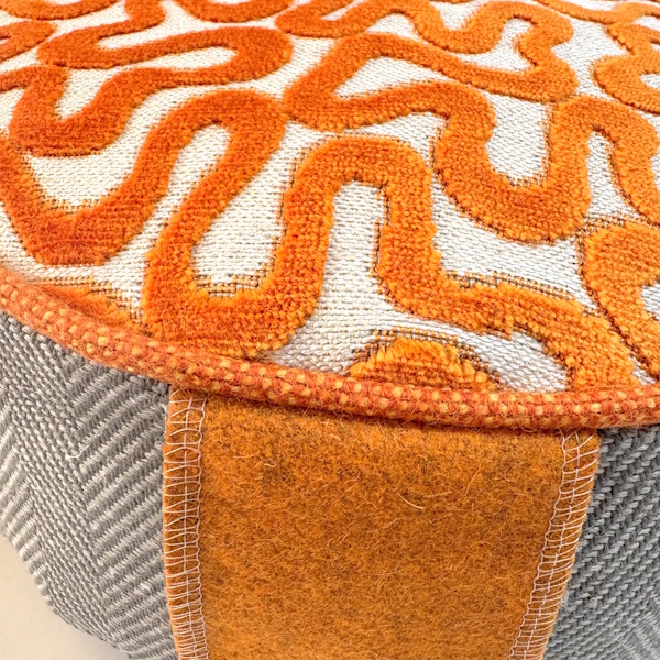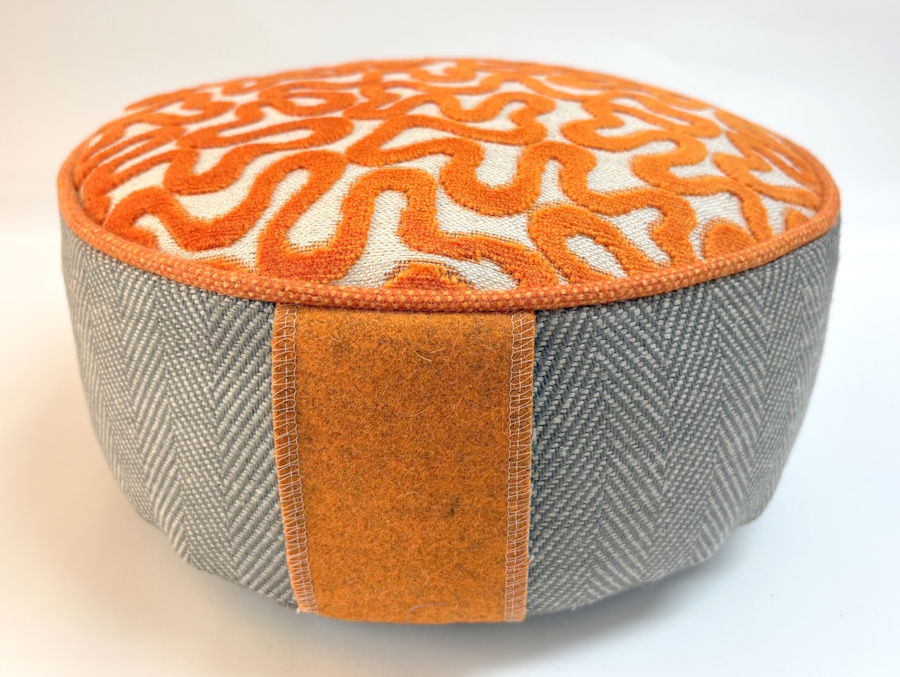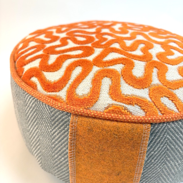 Oranje meditatiekussen met velours top, wollen handvat en bies met een zijkant van linnen.