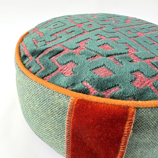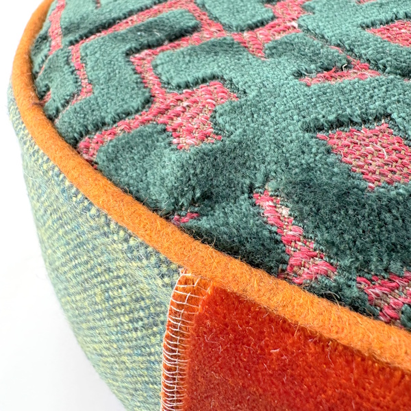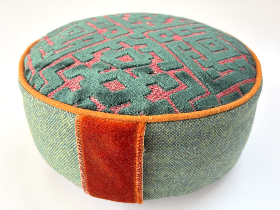Groen/oranje meditatiekussen met velours top, handvat van fluweel, zijkant en bies van wol.