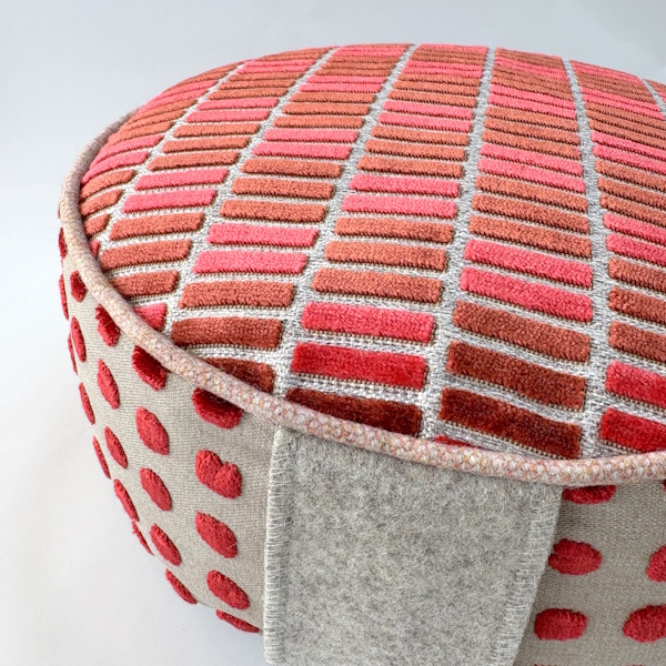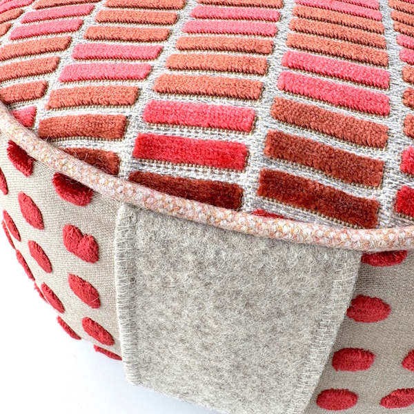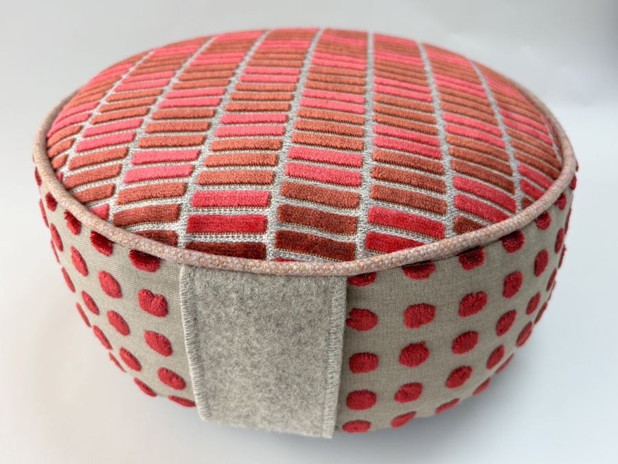 Meditatiekussen in en rode kleur met velours top, handvat & bies van wol en zijkant van katoen.