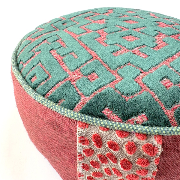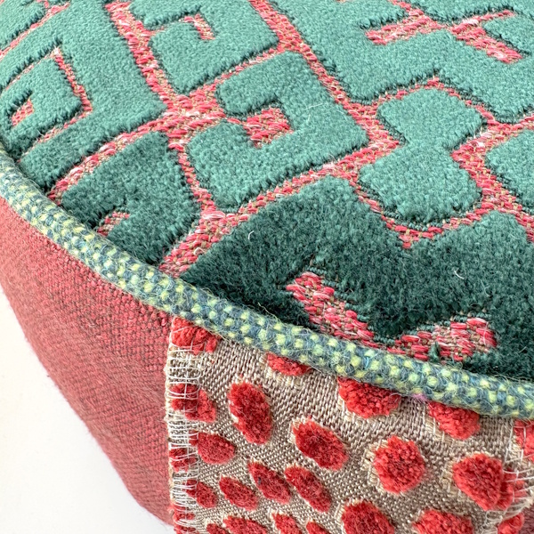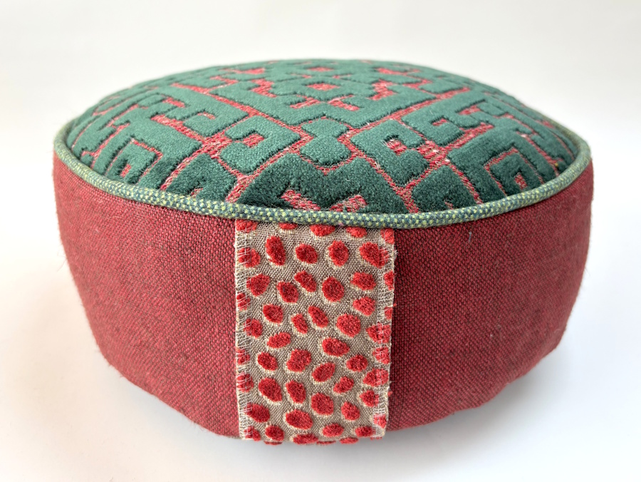 Groen/rode meditatiekussen met velours top & handvat, wollen bies, zijkant van linnen.
