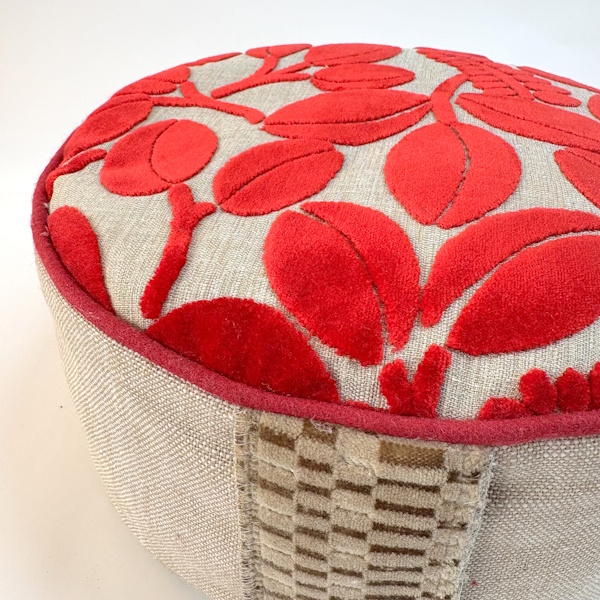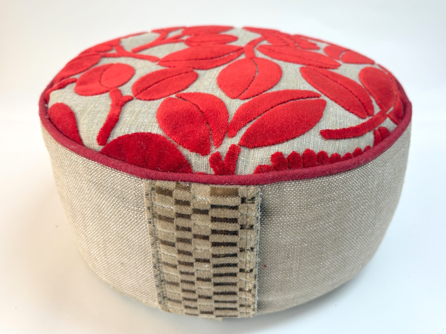 Rood meditatiekussen met velours top & handvat, wollen bies, zijkant van linnen.