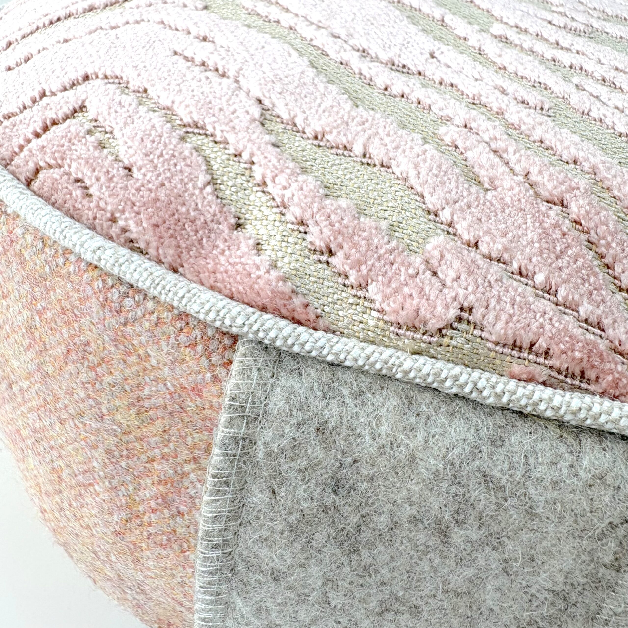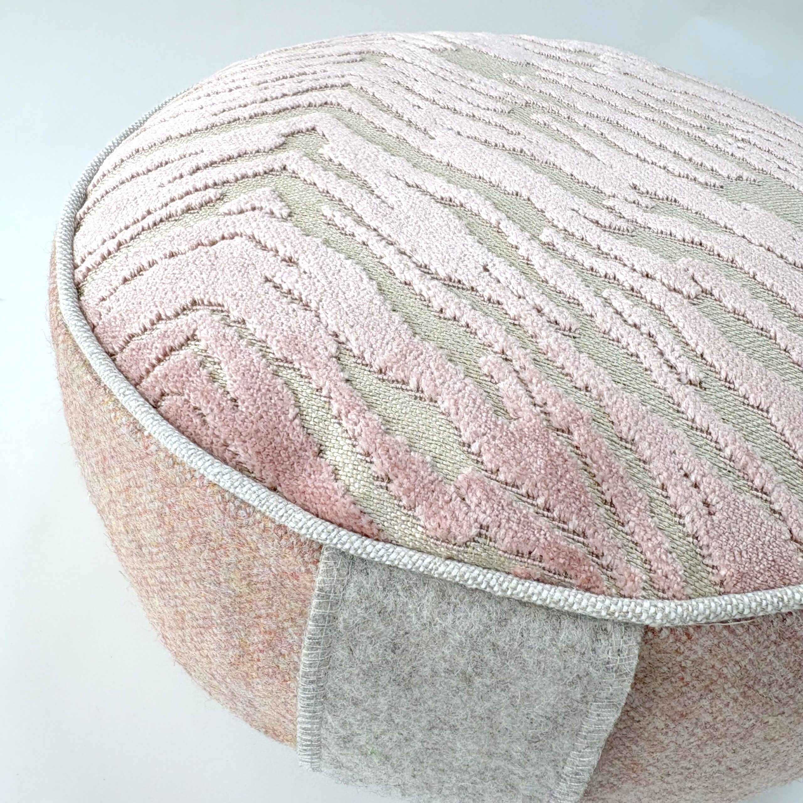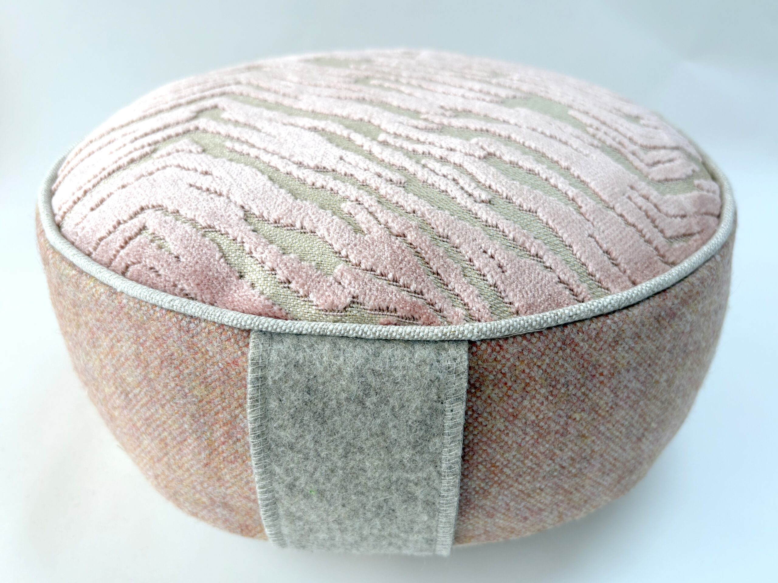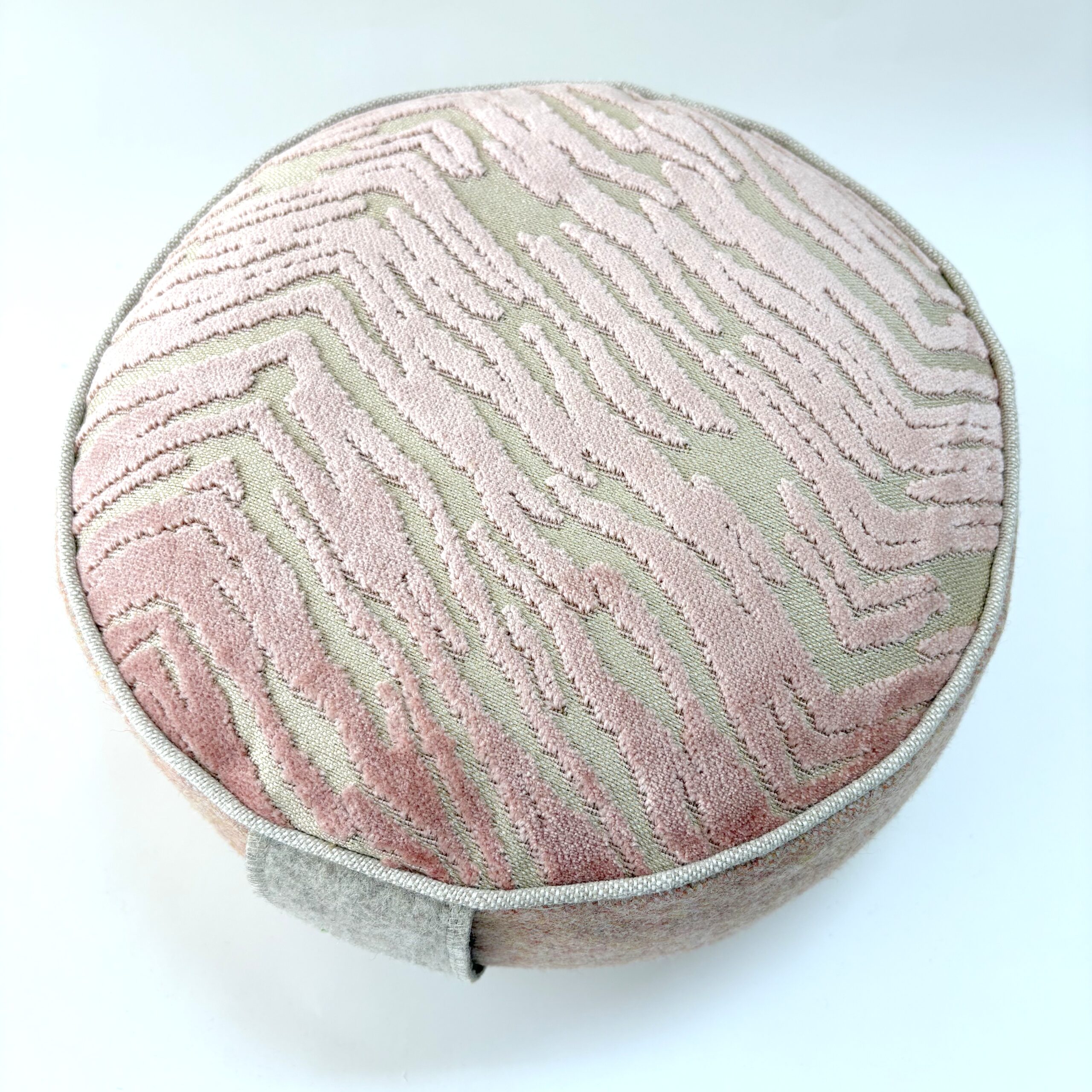 Meditatiekussen in en roze kleur met velours, wollen zijkant en handvat en bies van linnen.
