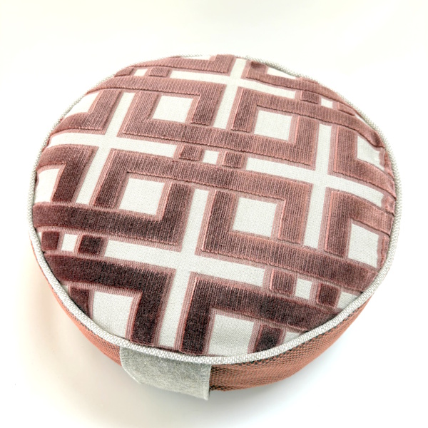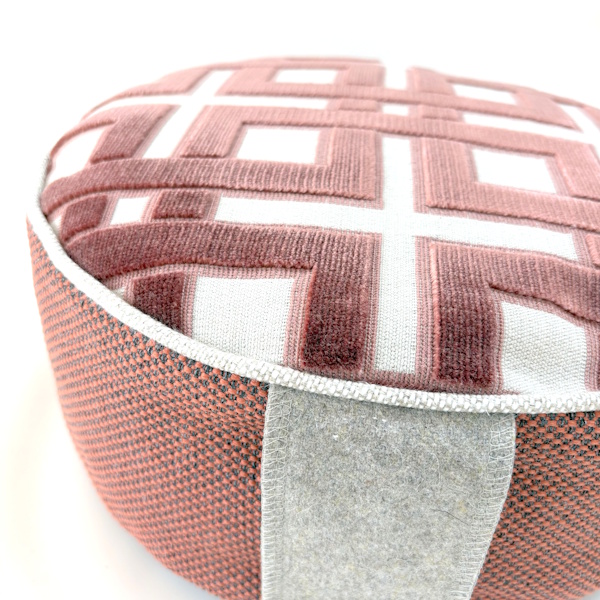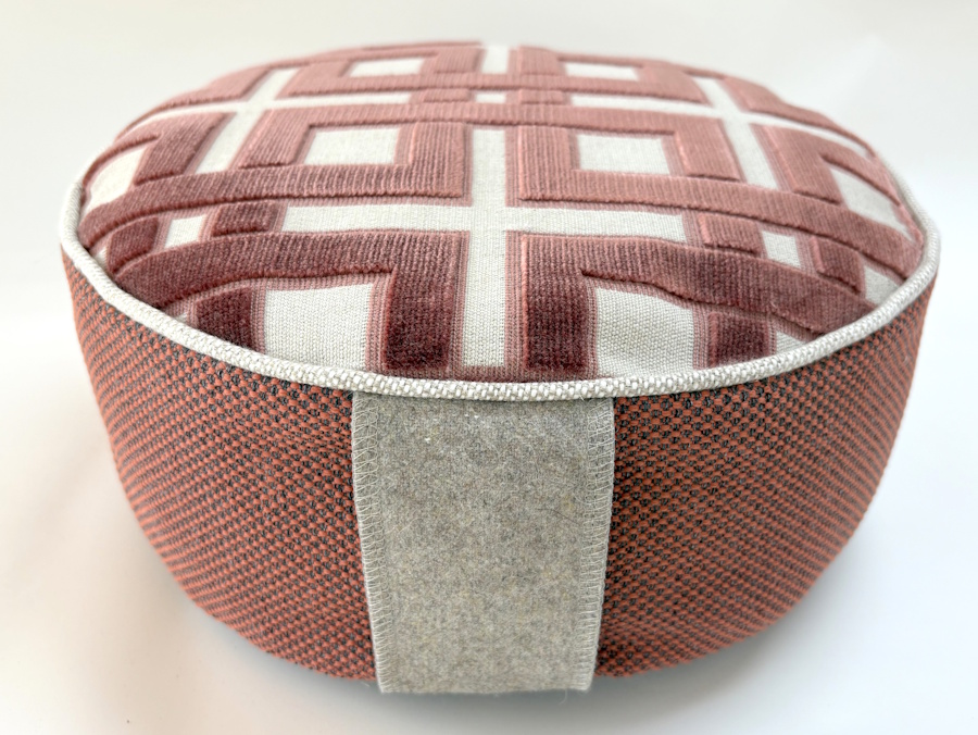 Meditatiekussen met velours top, linnen bies, wollen handvat en katoenen zijkant.