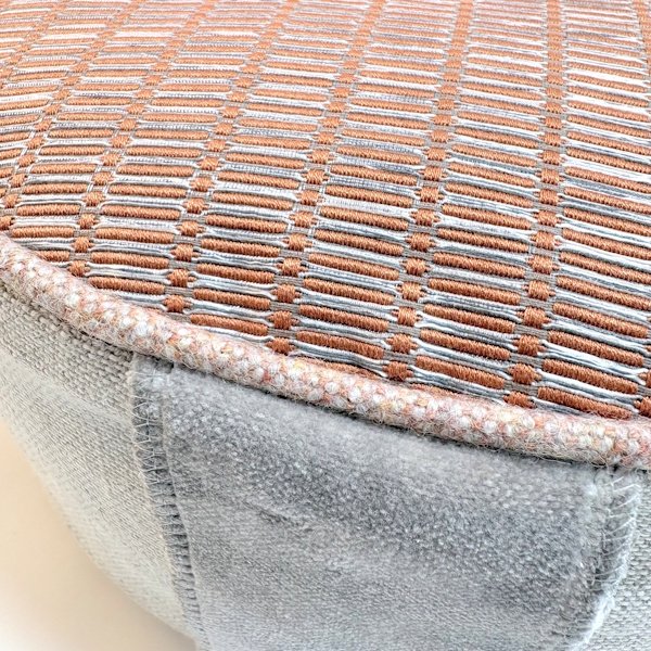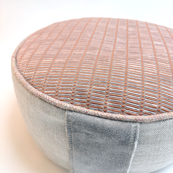 Meditatiekussen met geweven top met zilverdraad, wollen fluwele velours handvat, bies van wol en zijkant van linnen.