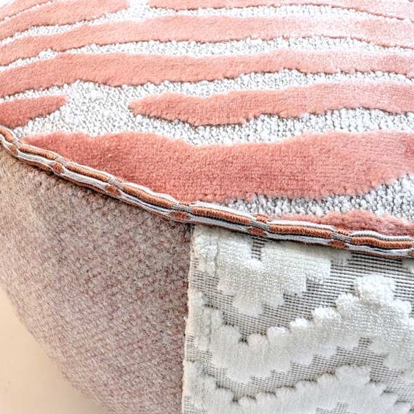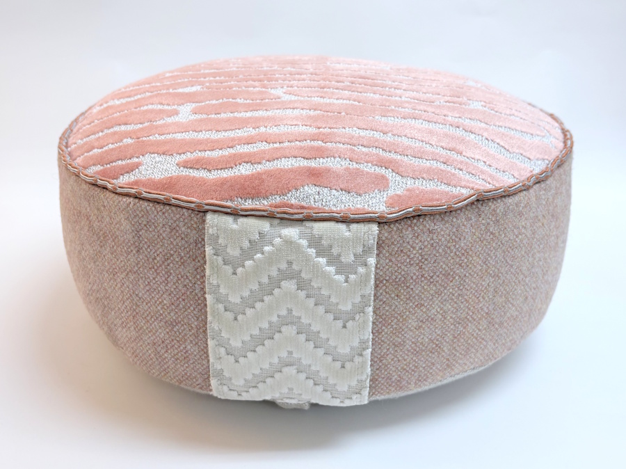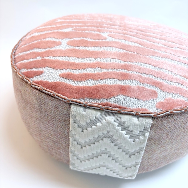 Meditatiekussen met een velours top en handvat, bies van geweven stof met zilverdraad, wollen zijkant.
